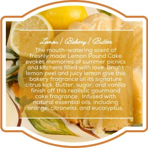 Indulge in the mouthwatering aroma of freshly baked Lemon Pound Cake. This delightful fragrance captures the essence of summer picnics and home-baked goodness. Bright lemon peel and juicy lemon provide a zesty citrus kick, while butter, sugar, and vanilla add a touch of sweet indulgence. Infused with natural essential oils, including orange, citronella, and eucalyptus, this fragrance is a true sensory delight.